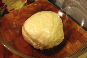 Once the dough as risen and become spongy, turn it out onto a lightly floured surface. Divide the dough into 3 equal pieces. Cover and let rest for about 10 minutes so it will be easier to roll.