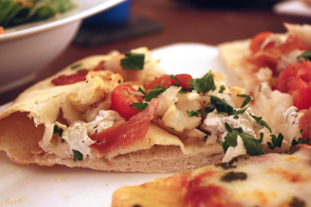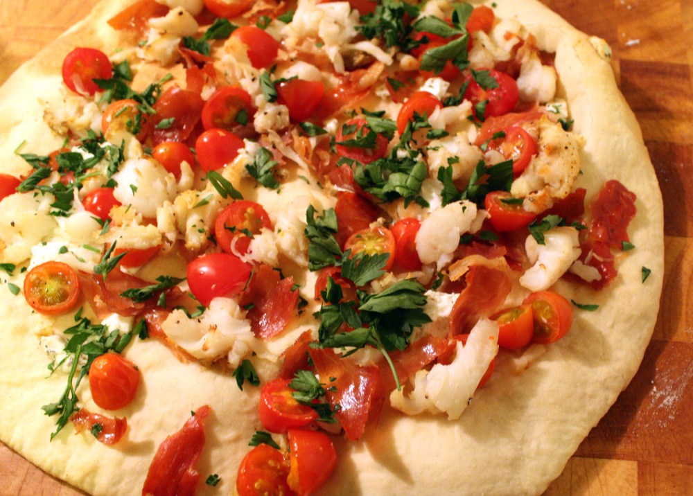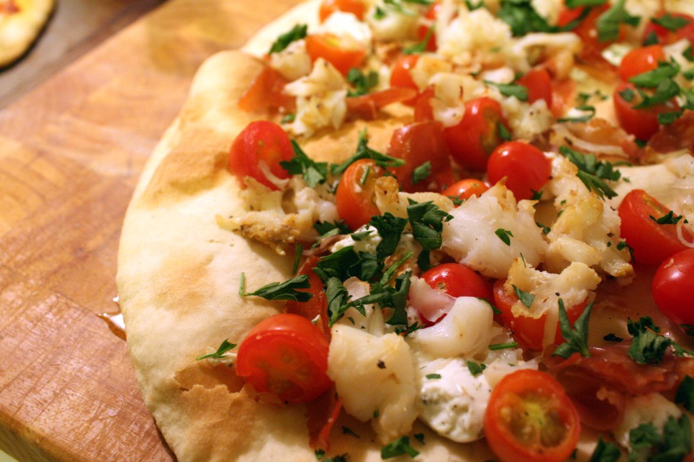 Remove dough from the oven and top with goat cheese, lobster, pancetta and tomatoes. Place back in the oven and bake until the cheese starts to melt. Remove from the oven, sprinkle with parsley, cut into wedges and serve immediately.