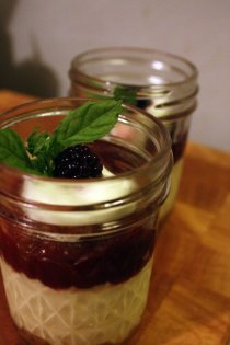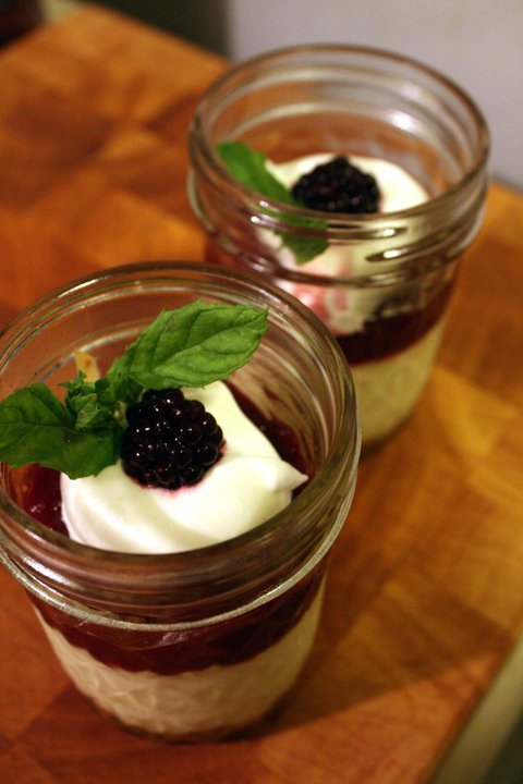 Top cheesecakes with blackberry curd, screw on the lid and chill for 2 hours. Before serving, top with whipped cream, fresh blackberries and a sprig of mint.