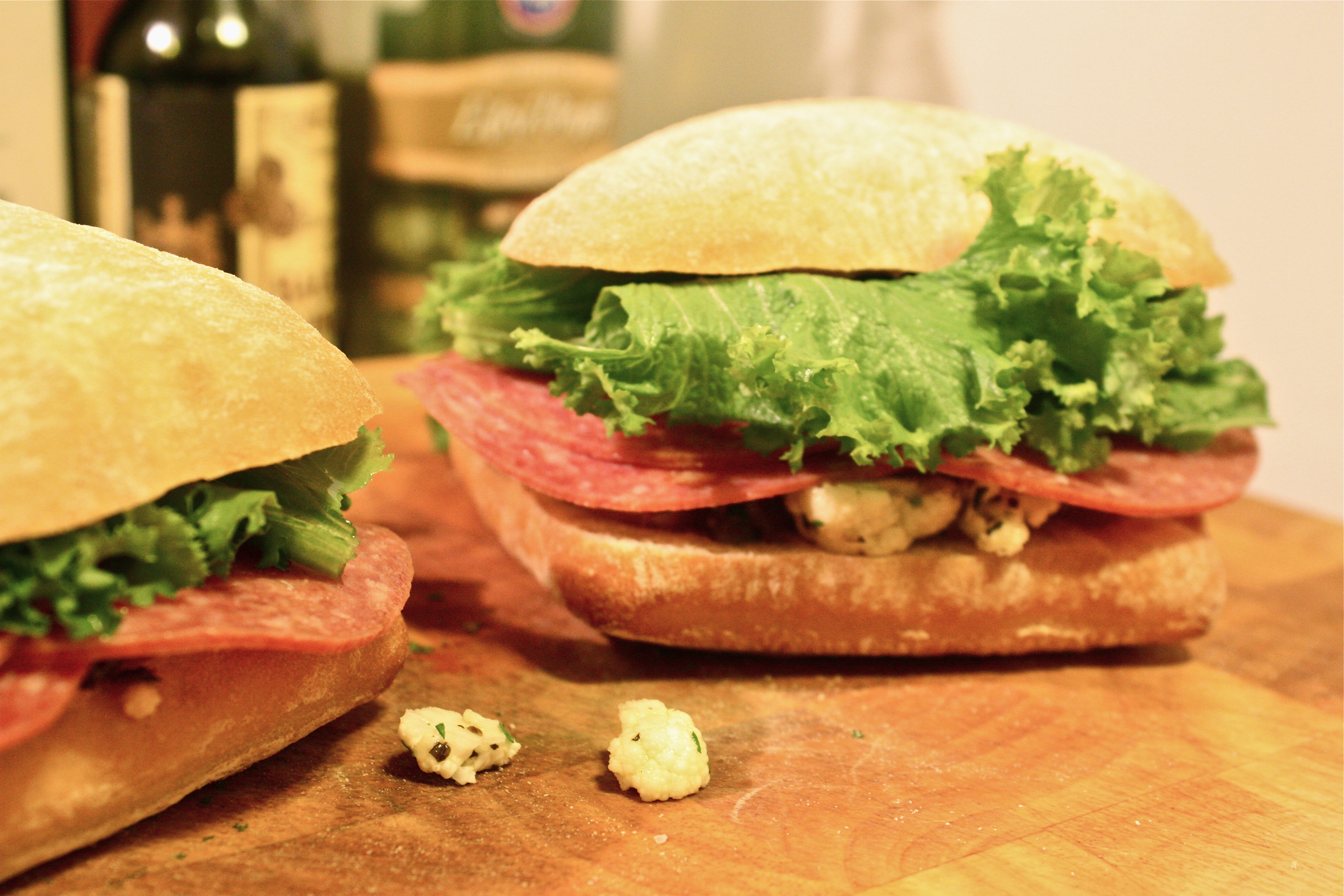 To assemble sandwiches, cut ciabatta rolls in half (tip: cut the bottom of the bread a little thicker so the marinade soaks in).  Place the marinated cauliflower on the bottom half of the bread, top with salami and bitter greens.  Spread the Dijon on the top half of the bread and cap the sandwiches.   Cut into halves and serve.