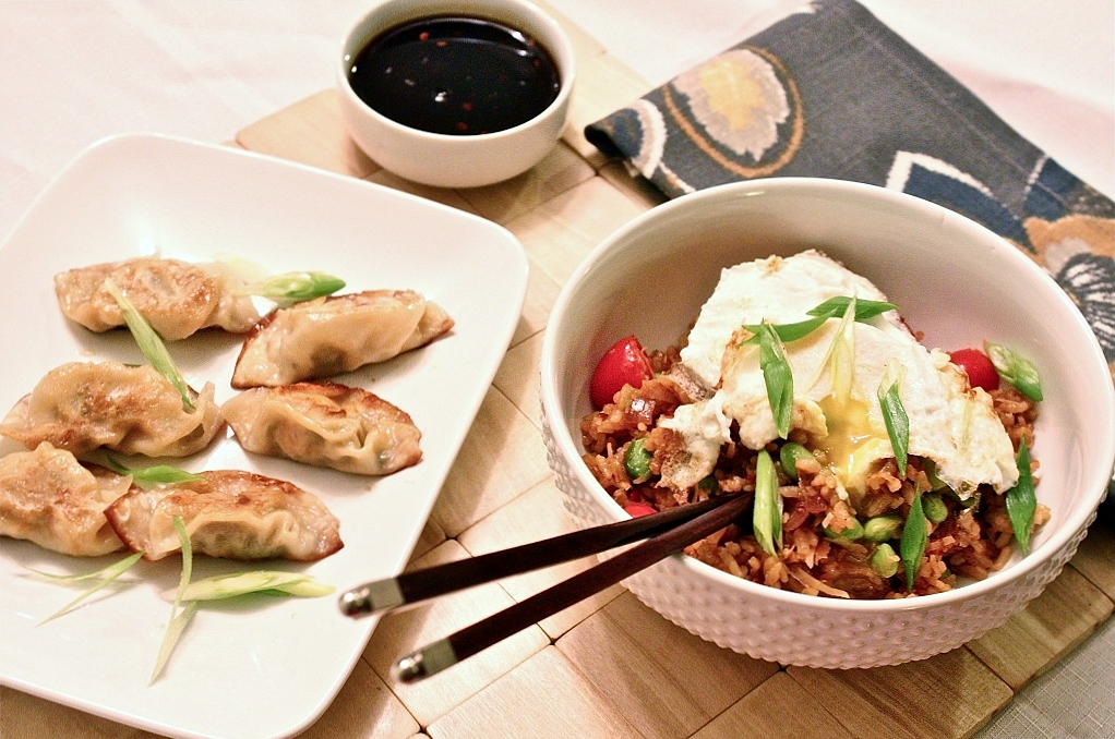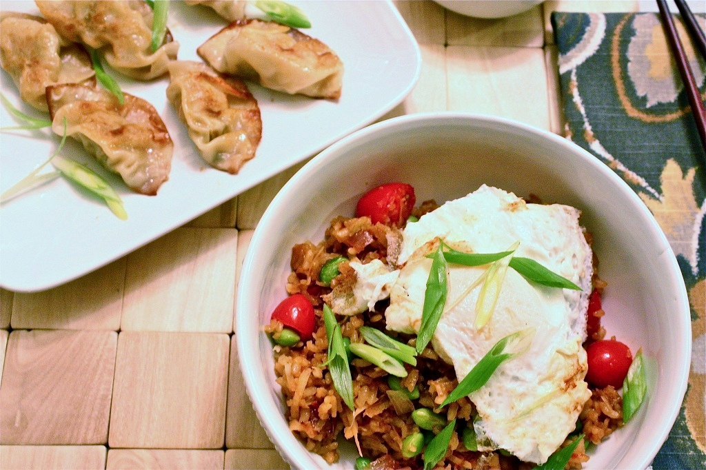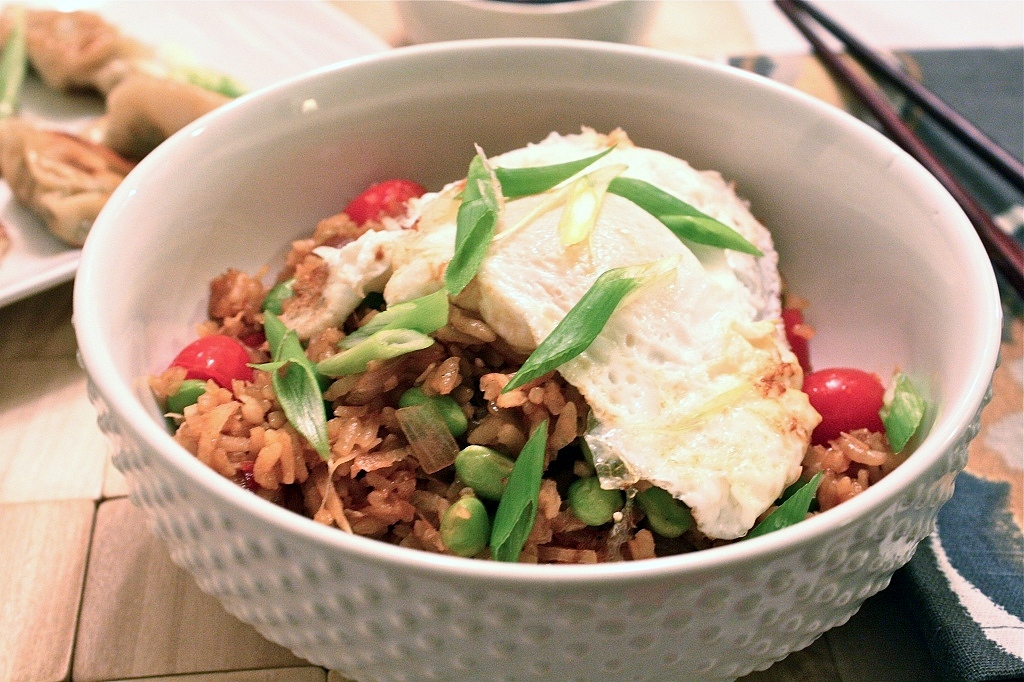 Heat a little more oil in a non-stick skillet over medium heat (I usually just use the pan I fried the rice in, remove it from the stove for a minute to cool it off).  Crack the eggs into the skillet and cook until over easy.  You want the yolk to still be runny.  Place one egg on top of each bowl of rice.