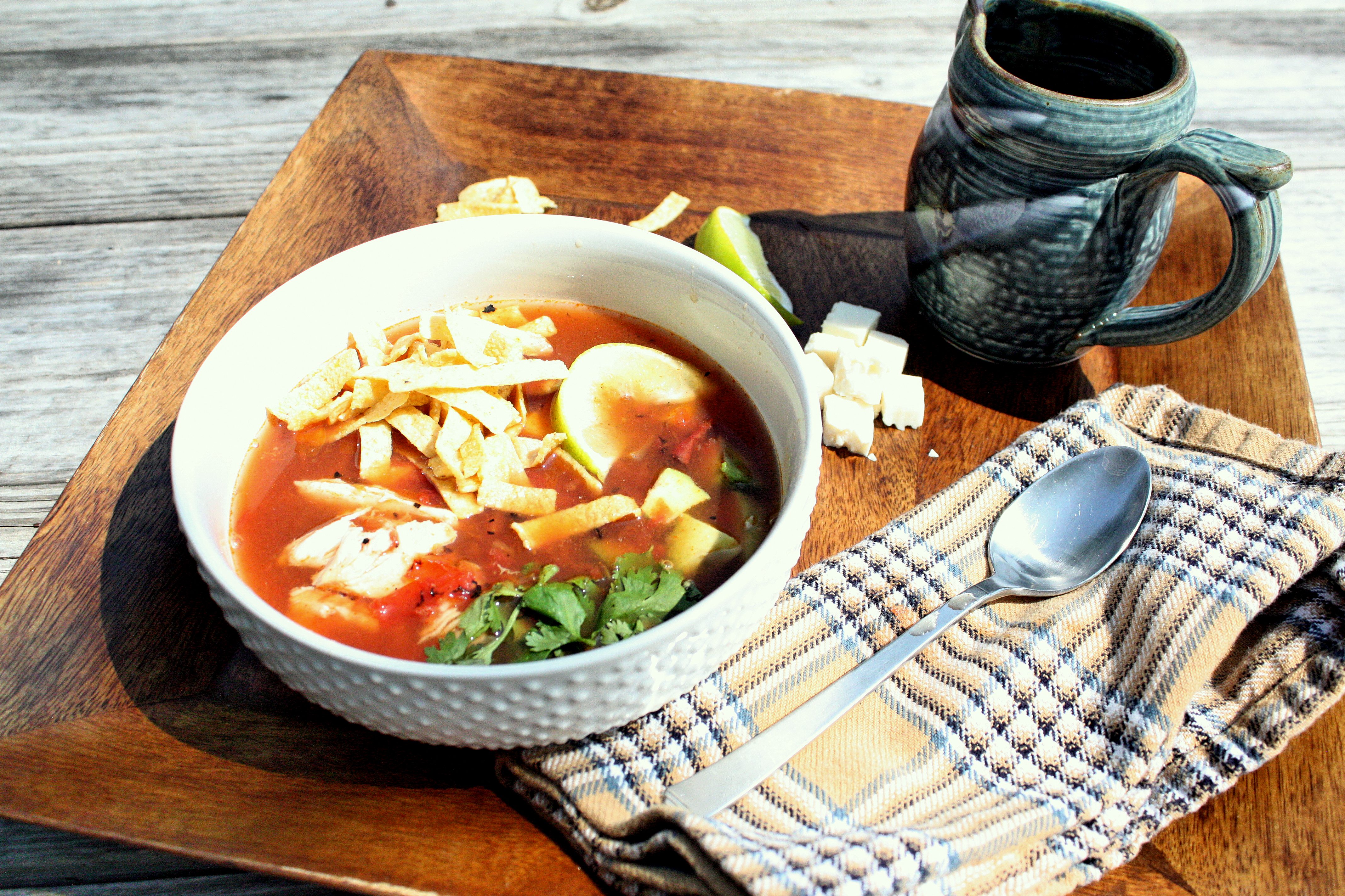 As I’ve said before, one of the ways we like to reminisce is to recreate the meals we enjoyed on a special vacation. In this case I’m craving the Tortilla Soup from Casa Rio on the River Walk. We went here several times while we were in San Antonio for authentic Mexican comfort food. After much trial and error this recipe is as close as I’m going to get. Now if I just had rainbow umbrellas and a lazy river I’d be all set!